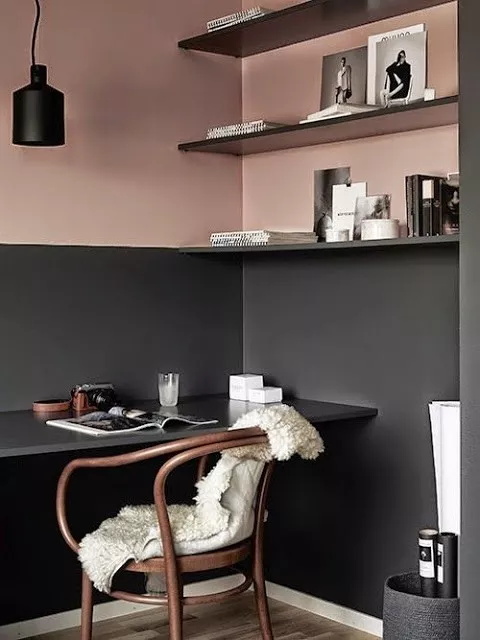 這個讓兩種顏色在墻上“平分秋色”的細節可以把深色和淺色同時帶入室內,顏色占用的比例可以根據情況而有所改變,也不一定是上下比例一致。