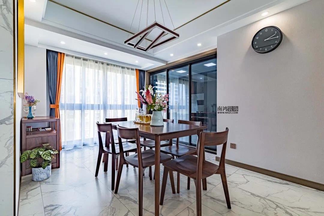 戶 型 圖 設計說明: · 玄關口的次臥門改動,側面做了鞋柜; · 餐廳與客廳均包進陽臺,擴大使用面積; · 改動客衛墻使餐廳開間增大,衛生間做干濕分離; · 原結構圖中的一間書房一分為二,做了主臥的走入式衣庫和北臥的學習區。 入戶過道放置銀色方柜,勾勒金色線條與背景墻、頂面呼應,明黃的花色和虎皮蘭的綠意為家里引入蓬勃的生機。 客廳通鋪大理石地磚,簡單的頂面采用香檳色不銹鋼線條走邊,橙黃+深藍的軟裝色彩搭配令人眼前一亮。 客廳納入陽臺,拓展了使用空間。原木的組合式茶幾與電視柜呼應,大理石的電視背景墻結合木飾面,提升空間質感。 客廳望向餐廳視角,內外通透,視線流暢。 納入客廳的陽臺空間被打造成休閑區,一旁擺放了花盆架,儼然是一處消解疲憊、享受愜意的清新小花園。 餐廳,黑胡桃木的餐桌椅溫潤質樸,展現出低調的姿態,墻上一幅簡框畫營造出溫馨輕松的就餐氛圍。 泡一杯清涼解暑的檸檬茶,品味生活的獨特滋味。 廚房,白色瓷磚搭配深灰色木質櫥柜門,內嵌現代廚電和雙門冰箱為屋主每日下廚提供便利。 臥室色彩柔和,灰紫色的硬包背景不加過多修飾,藍粉搭配的窗簾為房間注入清爽氣息,明亮光線帶來整室的溫暖。 客衛干區,區別于以往的硬墻式隔斷,設計師使用不銹鋼配夾絹玻璃的隔斷形式,令這方空間增色不少。高顏值臺上盆搭配圓框鏡,更顯時尚。 衛生間內,木質臺盆柜組合黑色五金件,簡單利落,鏡柜設計了收納格方便日常使用。淋浴區專門開鑿了壁龕,增加儲物空間。 | 地址:沾橋新苑 | 面積:160㎡ | 風格:現代輕奢 | 設計施工:浙江南鴻裝飾