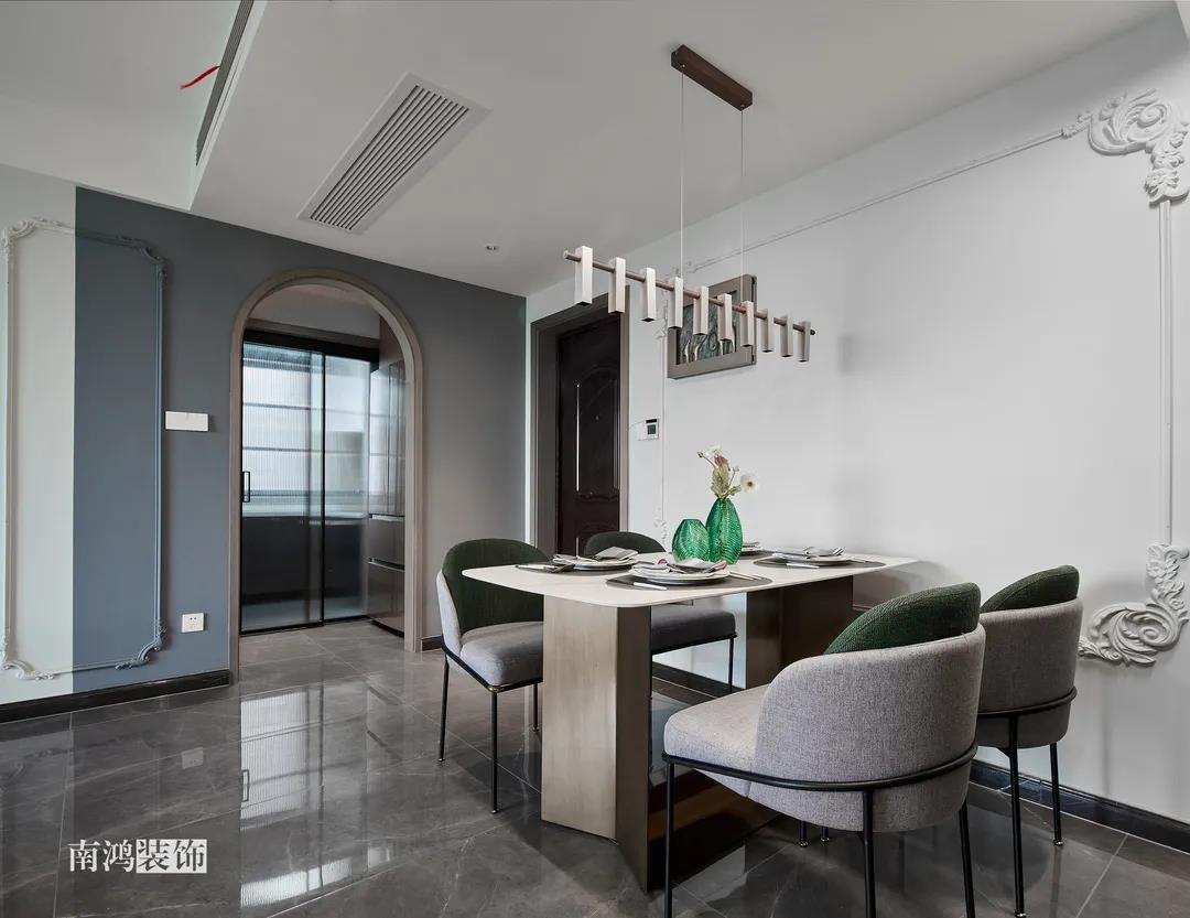 【項目·信息】 地址 / 世貿西西湖 戶型 / 三室兩廳 面積 / 91㎡ 風格 / 現代法式 設計施工 / 浙江南鴻裝飾 本案為91㎡現代法式風格作品。現代法式摒棄傳統法式繁復、冗雜的裝飾造型與甜膩的色澤,通過淡雅的色調,簡潔的幾何線條和典雅時尚的陳設軟裝,來打造更符合現代人喜好的生活空間。 業主夫妻倆,一位是性格沉悶的工程男,一位是熱情開朗的設計女,彼此志趣相投,性格互補,優雅的法式,給這個甜蜜小家庭增添了更多美妙情趣~ ▲原始結構圖 ▲平面設計圖 ①衛生間做干濕分離。 ②兒童房的門洞方向更改,完整電視背景墻效果。 ③主臥和次臥交換位置,次臥陽臺打通。 ④縮小主衛面積,墻體后退得以嵌入一個大衣柜。 入戶門進來即見餐廳。戶型面積不大,公區域都盡量打開讓視野更開闊。 硬裝整體簡潔,墻面可見石膏線花紋裝飾,借此強化一定法式空間意象。餐桌椅、吊燈的造型選擇也都偏現代,空間中奢與簡的分寸把握得恰到好處。 綠色作為本案的點綴色,可以說貫穿了幾乎各個分區之中,鮮活的生命力讓人過目難忘。 客餐廳一體式設計是小戶型的常見選擇,也更符合現代人的生活習慣。灰白主色保持整體低調,局部墻面以飽和度高的綠色乳膠漆涂刷,空間被提亮不少。 客廳采光良好,沙發背景墻連接干區的位置做一個小的半高柜,提升空間利用率。軟裝家具布置則用簡潔的設計手法將法式的古典優雅和現代的簡約時尚相結合,使得空間既有休閑感受,又不乏藝術氣息。 經過設計調整,電視背景墻的效果更加完整,深淺色調做左右兩塊分界,以石膏線裝飾則更顯精致。 拱形門洞也被應用在這里,作為歷史悠遠的一種經典建筑元素,本身就很契合各種帶古典意味的家居風格。 廚房以長虹玻璃門隔絕油煙,保證內部的私密性,也實現了采光的通透感。冰箱被移至過道,釋放內部更多空間。 廚房采用U型布局,動線流暢,烹飪區、操作臺和洗滌區都有各自獨立的空間,互不打擾。 主臥,青草綠墻布做背景裝飾,留白保持簡約調性,一幅婚紗照訴說著夫妻二人簡簡單單、明明白白的甜蜜愛情故事。 光源除主燈外,床頭兩側各有布置,一邊長臂燈一邊吊燈的不對稱設計,讓臥室空間顯得更加有趣,金屬材質呈現輕奢美感。 長輩房的背景、色彩選擇需要貼合老人的喜好,選用橙色主色,帶來如陽光般的燦爛、溫暖感受。 夫妻二人目前還沒有孩子,這個房間預備做以后的兒童房,布置相對簡單,方便將來調整。 衛生間將干濕區域分離,洗漱臺盆柜、壁柜與旁邊打造出的半高柜體可將瓶瓶罐罐都收入其中,保證視覺上的清爽。