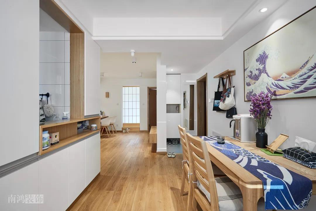 小戶型的餐廳比較適合做嵌入式餐邊柜,利用墻內(nèi)空間來做收納,能節(jié)約不少面積。
