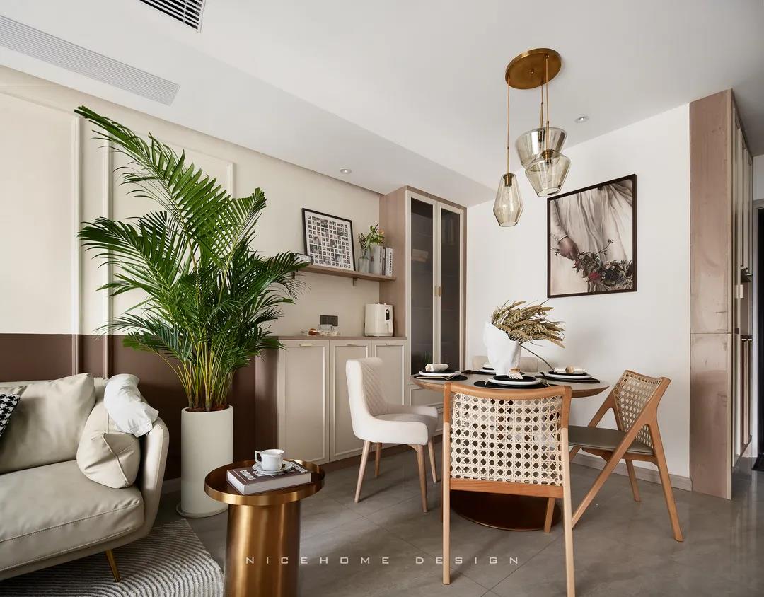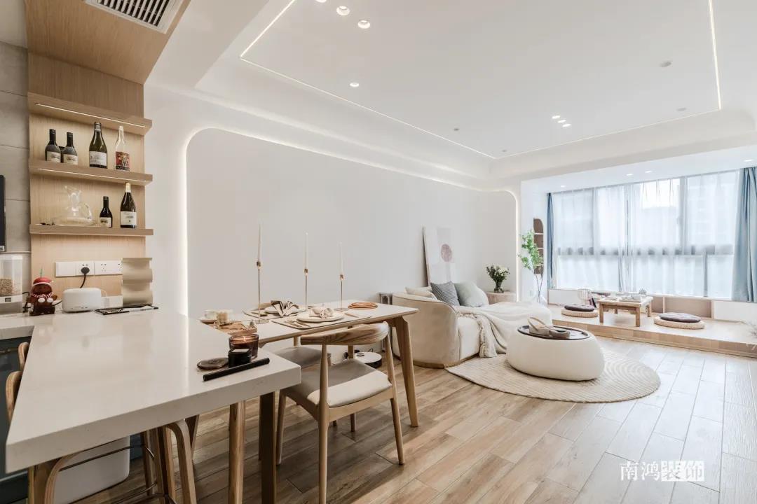 同理,客廳與餐廳都比較緊湊的話,不如就將二者做成一體式設(shè)計,功能放在同一個空間里,視野會因此變得開闊許多。