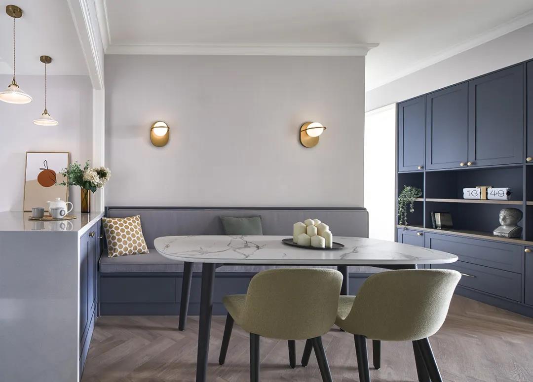 卡座設(shè)計具有節(jié)省空間和提供收納的雙重功用??ㄗ话愣际琴N墻,只需留出一邊過道就行,而且卡座可以結(jié)合收納柜,使得餐廳的收納能力大大提高。