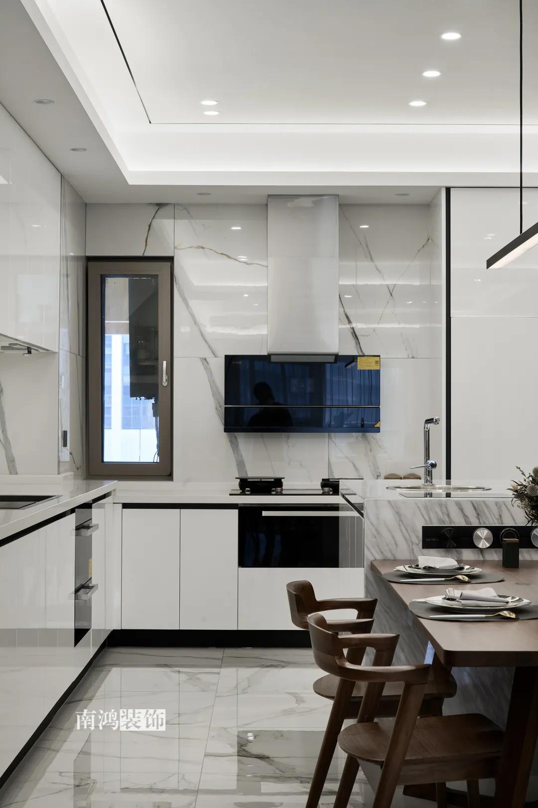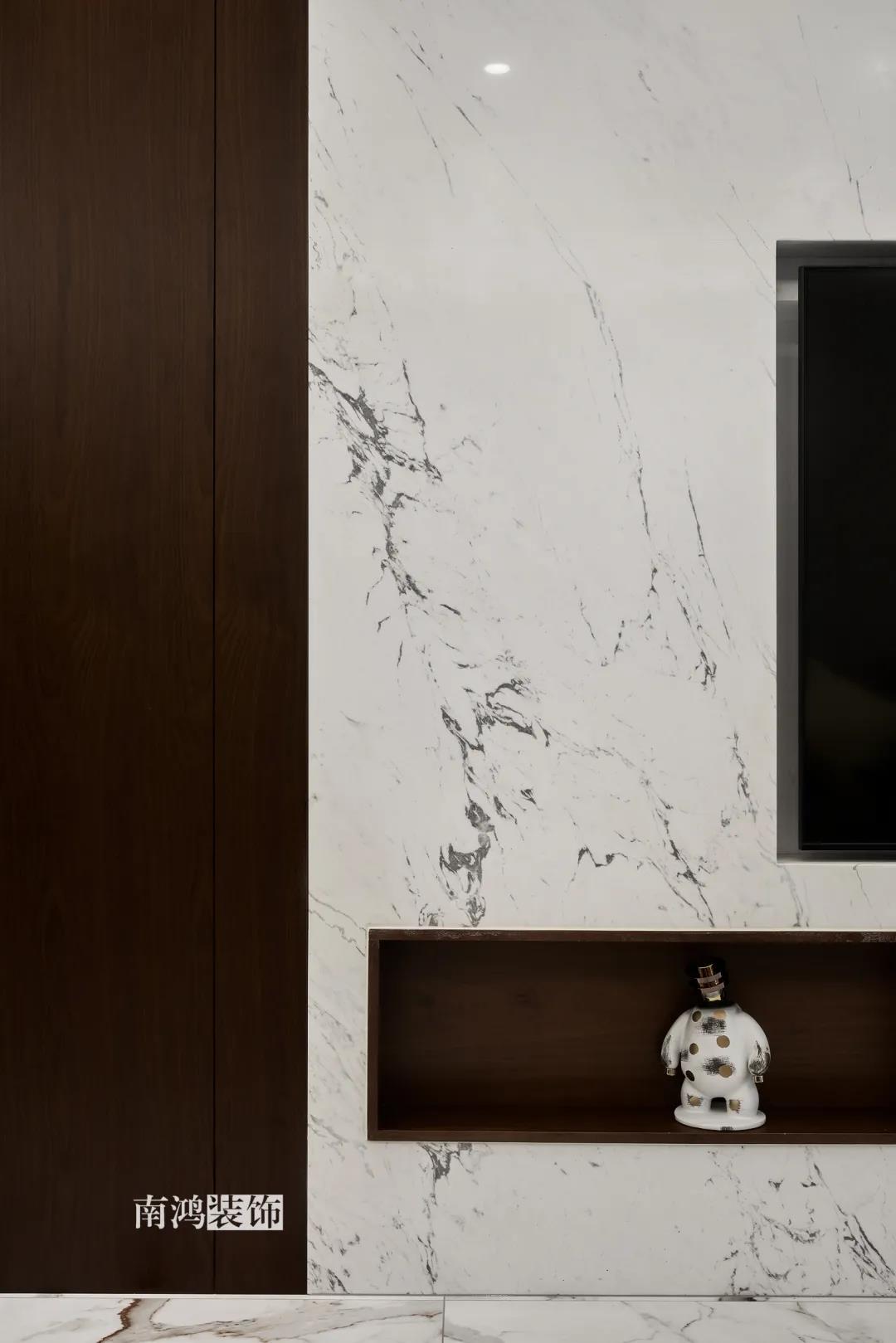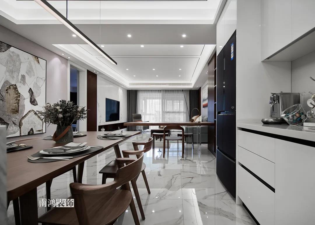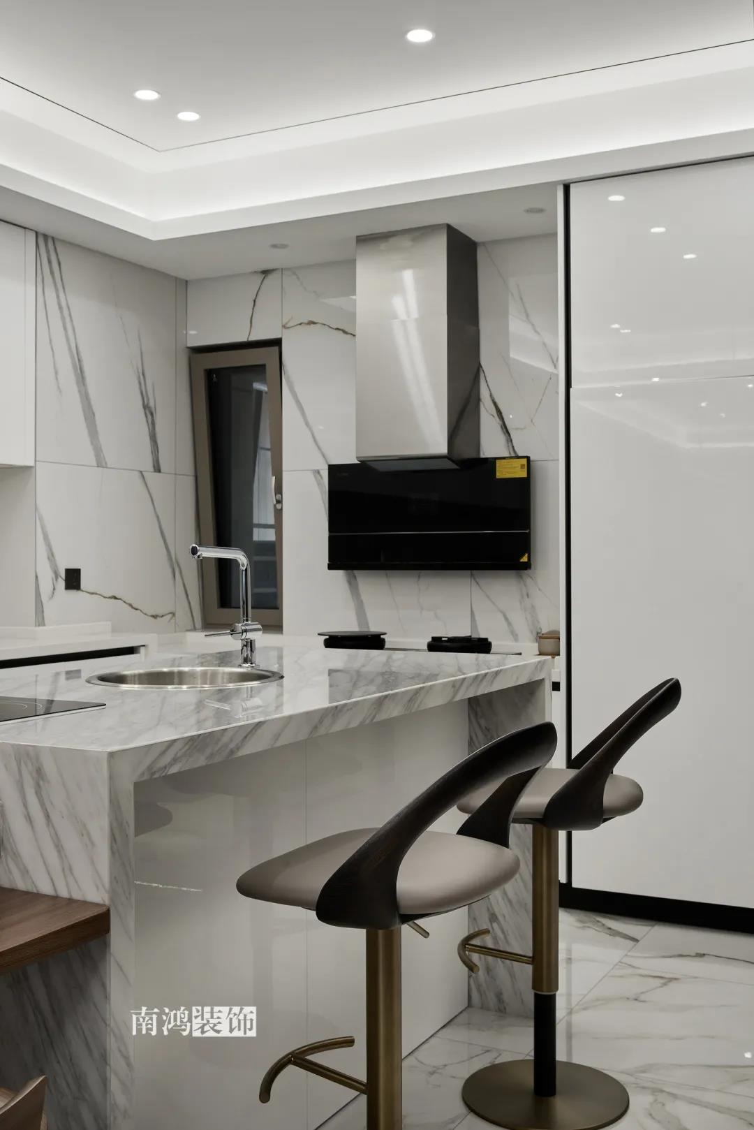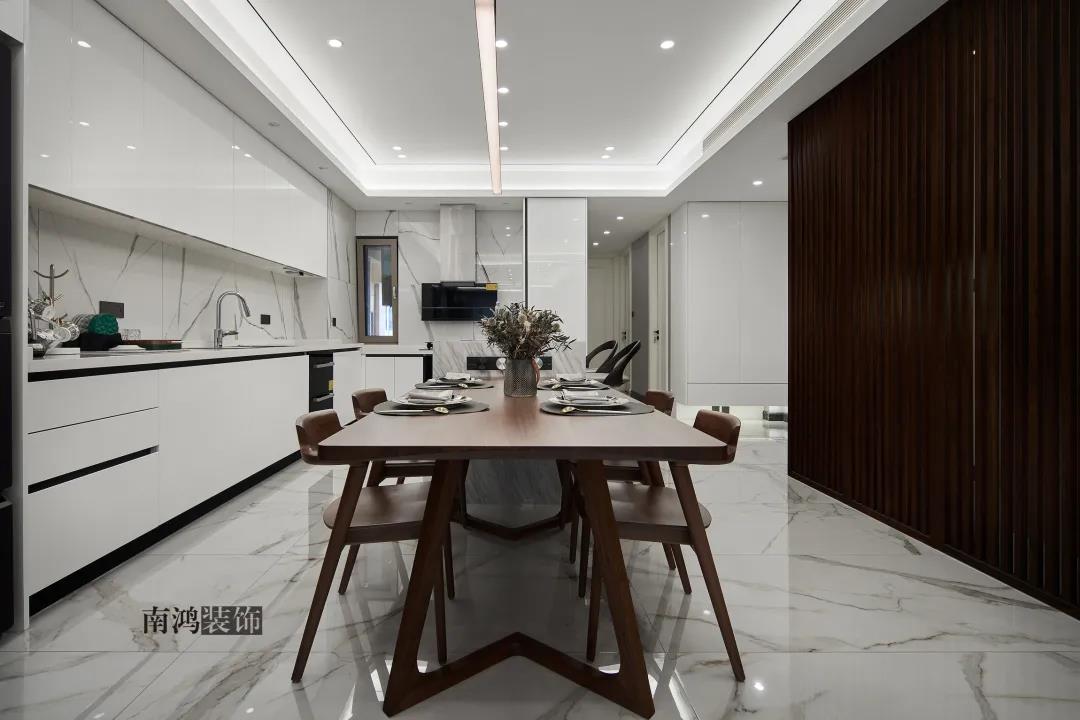 業主是一對年齡45歲左右的夫妻,事業穩定,家庭幸福。夫妻二人熱衷各類美食料理,所以對家里廚房的設計更加重視。 總體來看,戶型面積很大,三室兩廳的格局留給了公區域相當寬敞的可使用空間。設計與選材上秉承現代風格的原則,強調理性而寧靜的室內氛圍,穩重的木料與明朗的石材相配,實現物質與精神的雙重安放。 1、正門對廚房,以豎條木格柵做隔斷。 2、客餐廳兩塊區域中間做一個書吧用以分隔空間,增加層次性。 3、做開放式廚房,餐桌增添島臺,提升空間利用率與家人互動性。 4、北陽臺和女兒房打通,擴充女兒房的使用面積。 玄關 ENTRANCE 入戶玄關以深色的木格柵阻隔視線,既是風水上的考慮,又很好保護了室內隱私。地面通鋪白色瓷磚串聯內外,關于家的第一印象便在此構建。 細木條元素自帶美感,光影的變幻交錯間,涌動出不凡的藝術張力。 客廳 LIVING ROOM 低飽和度色彩與明朗的線條,傳達著主人對簡約品質生活的追求和向往。全屋頂面統一做無主燈裝飾,嵌入6毫米黑色金屬條,極細的線條感透出設計的巧思與靈動之美。 空間以簡潔敞亮的硬裝基礎,搭配素凈的顏色與舒適的軟裝,深色木質元素在其間跳躍點綴著,中和剛冷的石材光澤。 電視機嵌入大理石背景,墻面紋理與地呼應,下開收納格取代傳統電視柜的位置,立面干凈,層次更在一深一淺中凸顯。 視線無論由無主燈頂面還是地面延展,均是順暢無比,大戶型的氣派一覽無余。 客餐之間由小書吧自然過渡,可以當作一個開放式的書房使用,讀書、辦公、品茶、娛樂等多重功能恣意交互,單一空間由此衍生出諸多使用情境。 餐廳 DINING ROOM 餐廳與門廳相鄰,開放式餐廚設計滿足主人的所有美好想象。餐桌的胡桃木色與島臺、廚房的淺色形成對比,雅致的古韻與鋒利的現代感交匯,成為這個家個性的一面展示。 清晰筆直的黑白線條拉伸空間縱深感的同時,也讓客廳和餐廚的視野更顯朗闊。 溫潤的胡桃木紋理典雅大方,空間的詩意氛圍在簡約的線條層次中被有力烘托出來。 廚房 KITCHEN 既可以擴充廚房操作臺面,又能當吧臺使用的島臺,和餐桌結合在一起,大大增加了使用頻率,搭配上款式輕盈的吧臺凳,毫無疑問是餐廚區的顏值與實力擔當。 開放式布局將廚房和餐廳融為一體,潔白柜體把嵌入式電器隱含其中,寬大的臺面足以滿足日常烹飪需求,環形的動線則可以讓人穿梭其中行走自如。 臥室 BEDROOM 主臥背景墻以灰色墻布和木飾面結合,細膩紋理展現有機的溫暖、純凈,燈光被有序在墻頂面安置,讓人倍感安神,又不失高雅格調。 床頭壁燈的瑩瑩微光,帶來夜的凝思。床尾放一把小羊羔絨椅,圓潤線條惹人喜愛。光影之間,居室氣質自顯。 寧靜灰是次臥的主導色,納入的陽臺讓室內采光更加充足,滿滿當當的柜體則將空間的收納力放大到極致。 陽臺被細心布置為休閑一角,為主人譜寫出愜意的生活橋段。 衛生間 BATHROOM 衛生間整體保持極簡的格調,黑白配色更顯潔凈,臺盆柜纖巧落地,視覺上倍感輕盈。