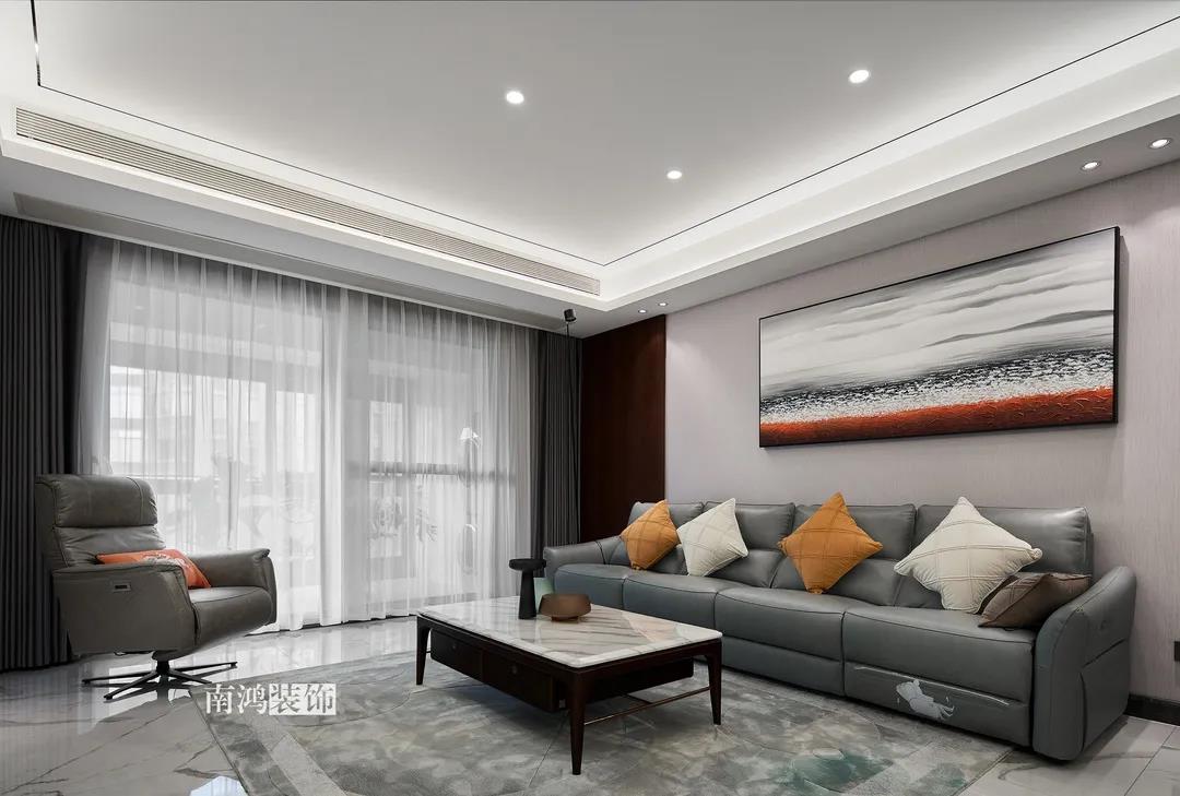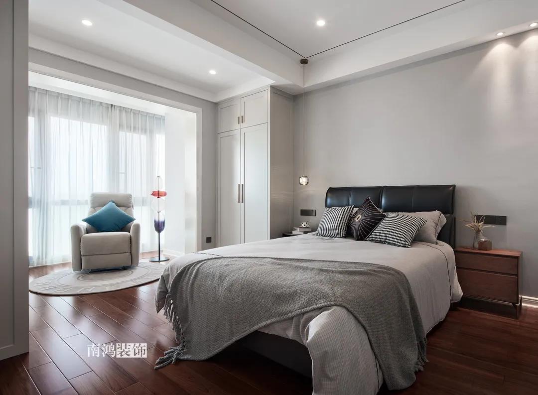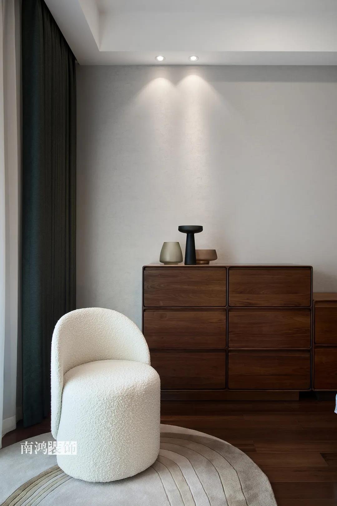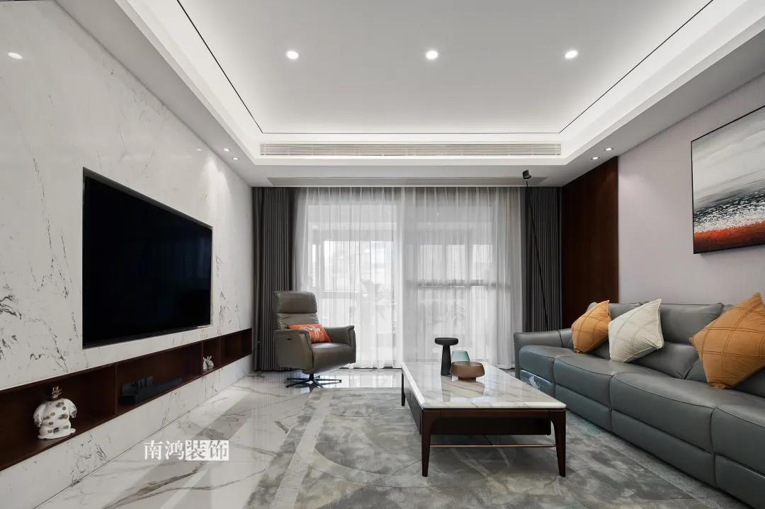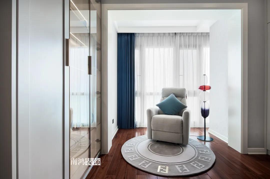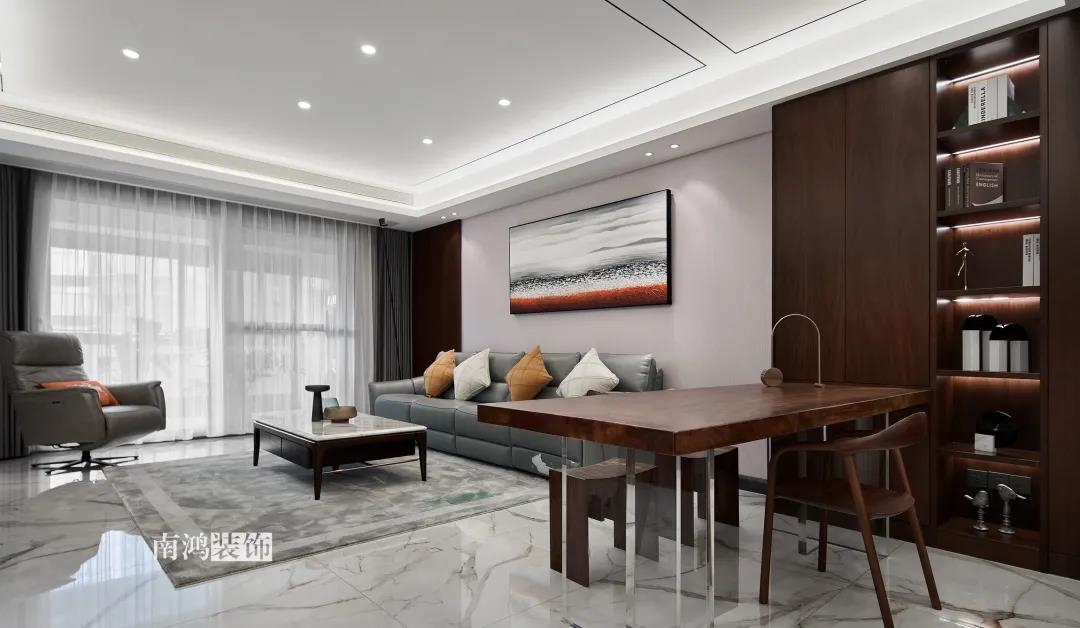 業主是一對年齡45歲左右的夫妻,事業穩定,家庭幸福。夫妻二人熱衷各類美食料理,所以對家里廚房的設計更加重視。 總體來看,戶型面積很大,三室兩廳的格局留給了公區域相當寬敞的可使用空間。設計與選材上秉承現代風格的原則,強調理性而寧靜的室內氛圍,穩重的木料與明朗的石材相配,實現物質與精神的雙重安放。 1、正門對廚房,以豎條木格柵做隔斷。 2、客餐廳兩塊區域中間做一個書吧用以分隔空間,增加層次性。 3、做開放式廚房,餐桌增添島臺,提升空間利用率與家人互動性。 4、北陽臺和女兒房打通,擴充女兒房的使用面積。 玄關 ENTRANCE 入戶玄關以深色的木格柵阻隔視線,既是風水上的考慮,又很好保護了室內隱私。地面通鋪白色瓷磚串聯內外,關于家的第一印象便在此構建。 細木條元素自帶美感,光影的變幻交錯間,涌動出不凡的藝術張力。 客廳 LIVING ROOM 低飽和度色彩與明朗的線條,傳達著主人對簡約品質生活的追求和向往。全屋頂面統一做無主燈裝飾,嵌入6毫米黑色金屬條,極細的線條感透出設計的巧思與靈動之美。 空間以簡潔敞亮的硬裝基礎,搭配素凈的顏色與舒適的軟裝,深色木質元素在其間跳躍點綴著,中和剛冷的石材光澤。 電視機嵌入大理石背景,墻面紋理與地呼應,下開收納格取代傳統電視柜的位置,立面干凈,層次更在一深一淺中凸顯。 視線無論由無主燈頂面還是地面延展,均是順暢無比,大戶型的氣派一覽無余。 客餐之間由小書吧自然過渡,可以當作一個開放式的書房使用,讀書、辦公、品茶、娛樂等多重功能恣意交互,單一空間由此衍生出諸多使用情境。 餐廳 DINING ROOM 餐廳與門廳相鄰,開放式餐廚設計滿足主人的所有美好想象。餐桌的胡桃木色與島臺、廚房的淺色形成對比,雅致的古韻與鋒利的現代感交匯,成為這個家個性的一面展示。 清晰筆直的黑白線條拉伸空間縱深感的同時,也讓客廳和餐廚的視野更顯朗闊。 溫潤的胡桃木紋理典雅大方,空間的詩意氛圍在簡約的線條層次中被有力烘托出來。 廚房 KITCHEN 既可以擴充廚房操作臺面,又能當吧臺使用的島臺,和餐桌結合在一起,大大增加了使用頻率,搭配上款式輕盈的吧臺凳,毫無疑問是餐廚區的顏值與實力擔當。 開放式布局將廚房和餐廳融為一體,潔白柜體把嵌入式電器隱含其中,寬大的臺面足以滿足日常烹飪需求,環形的動線則可以讓人穿梭其中行走自如。 臥室 BEDROOM 主臥背景墻以灰色墻布和木飾面結合,細膩紋理展現有機的溫暖、純凈,燈光被有序在墻頂面安置,讓人倍感安神,又不失高雅格調。 床頭壁燈的瑩瑩微光,帶來夜的凝思。床尾放一把小羊羔絨椅,圓潤線條惹人喜愛。光影之間,居室氣質自顯。 寧靜灰是次臥的主導色,納入的陽臺讓室內采光更加充足,滿滿當當的柜體則將空間的收納力放大到極致。 陽臺被細心布置為休閑一角,為主人譜寫出愜意的生活橋段。 衛生間 BATHROOM 衛生間整體保持極簡的格調,黑白配色更顯潔凈,臺盆柜纖巧落地,視覺上倍感輕盈。