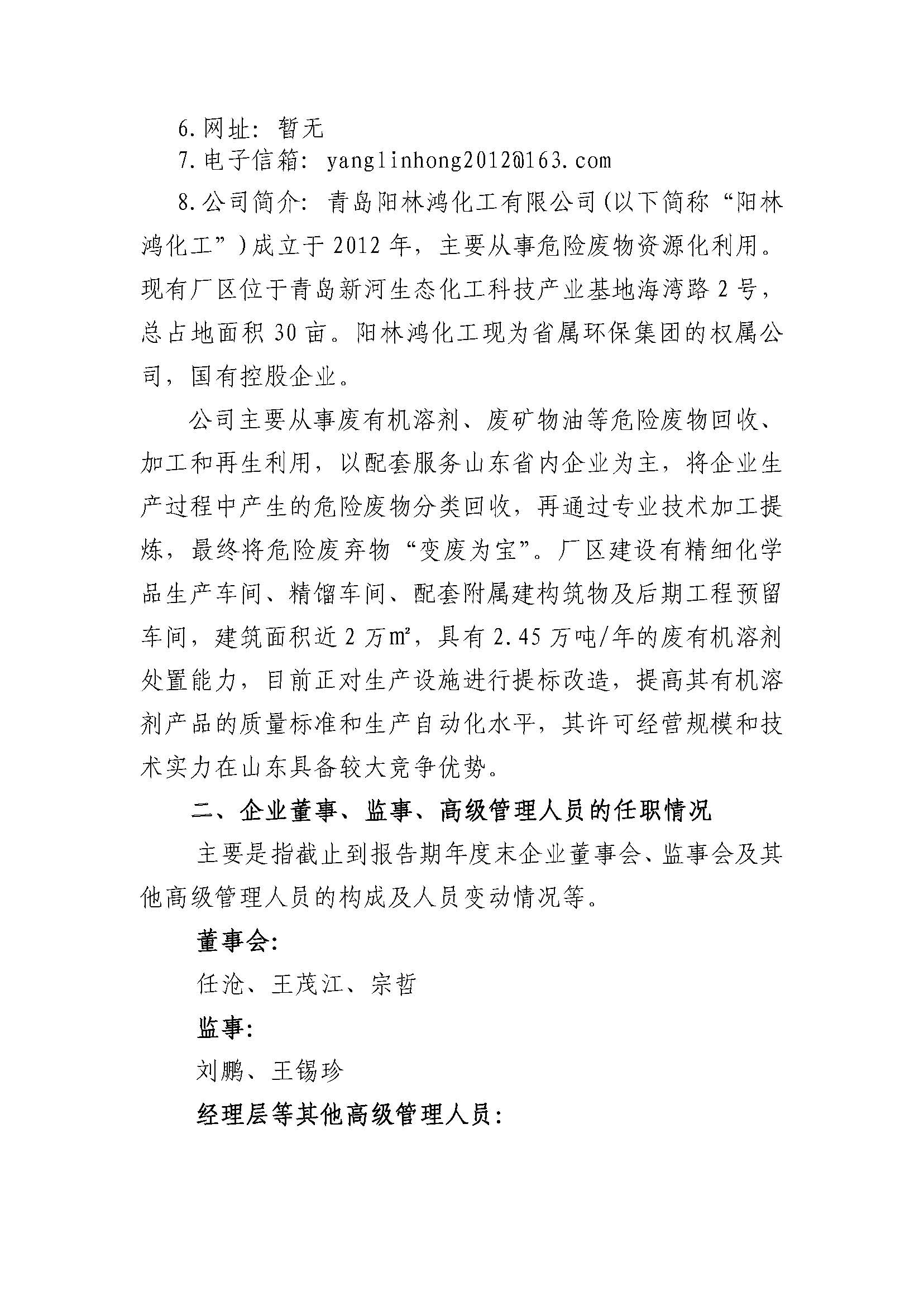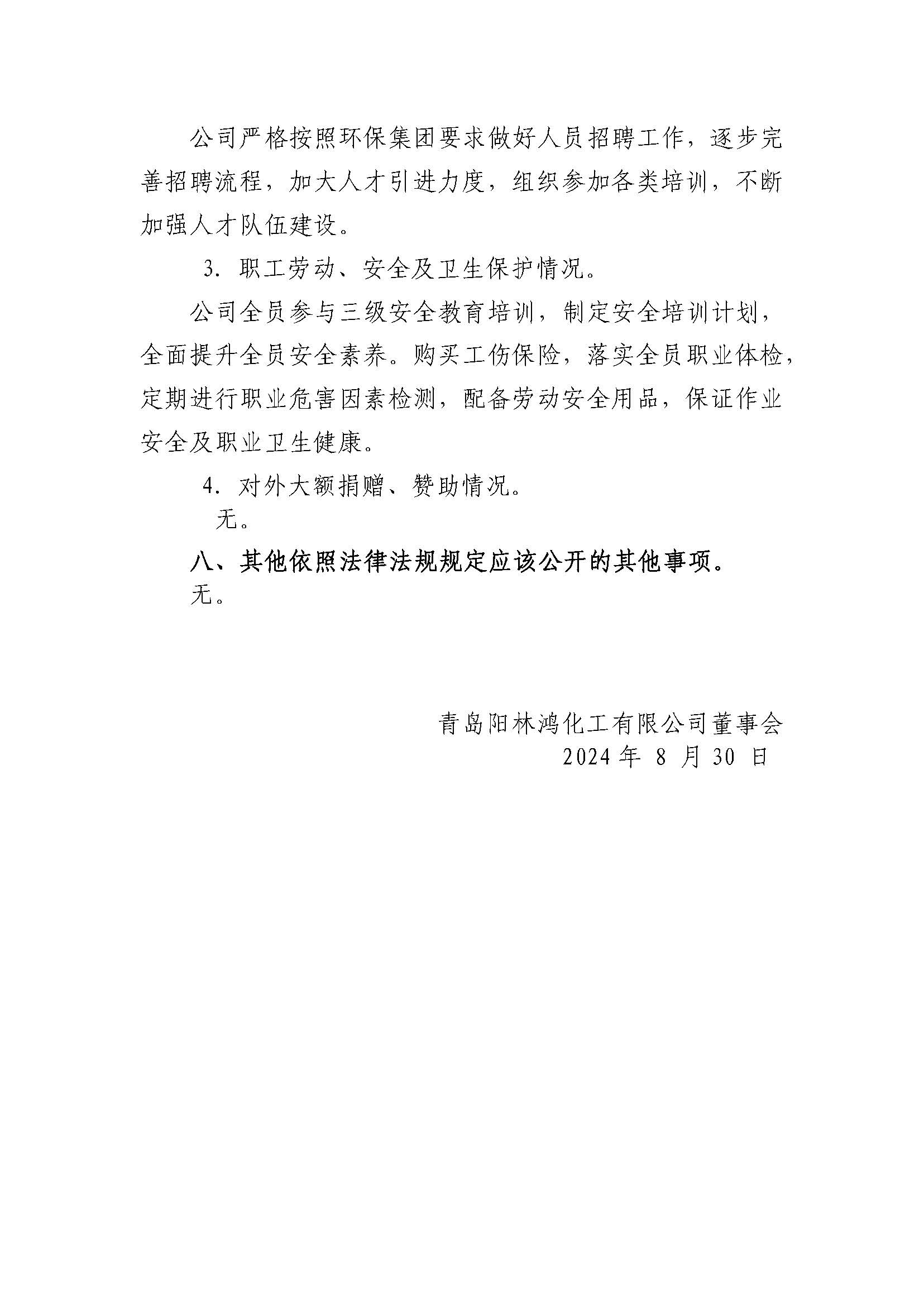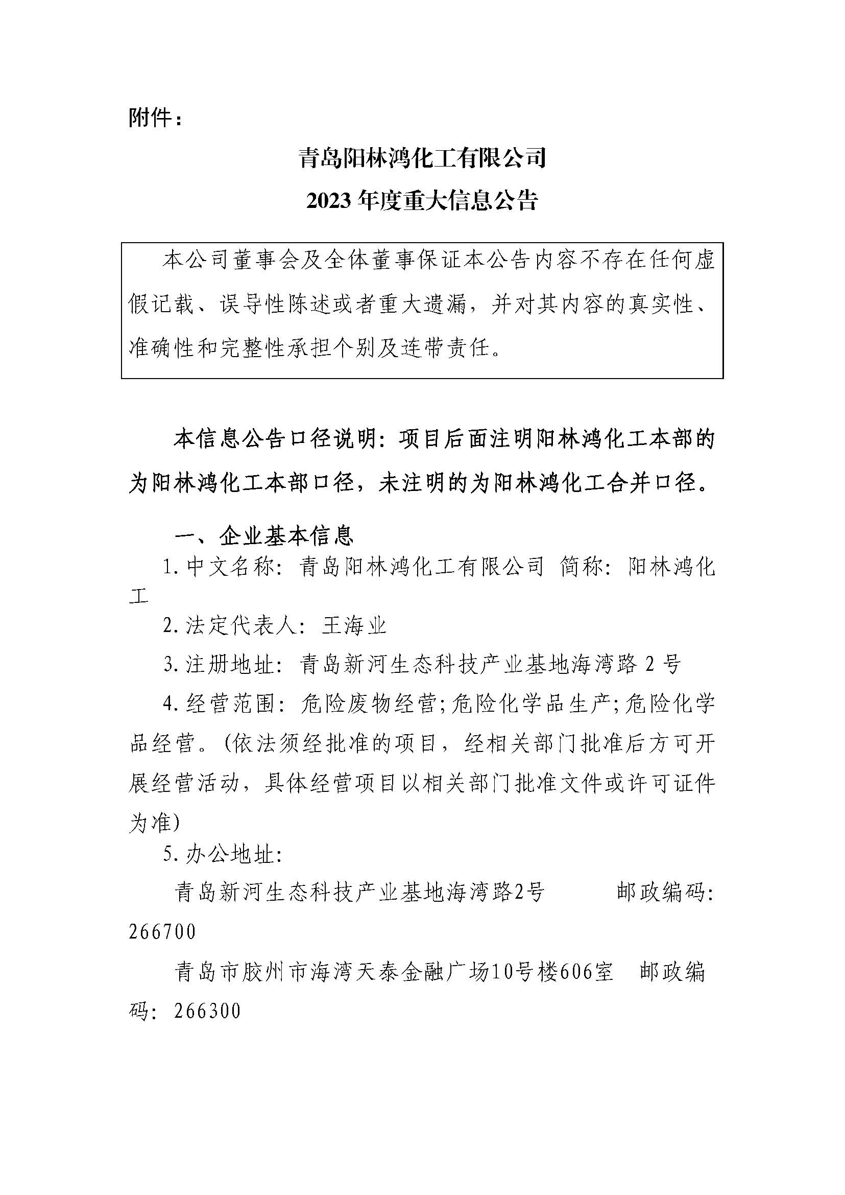 青島陽林鴻化工有限公司2023年重大信息公告